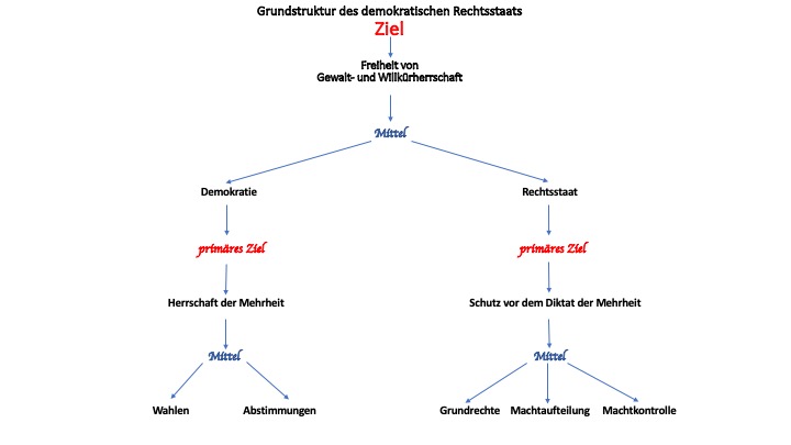 Der Rechtsstaat legt der Demokratie die notwendigen Fesseln an. Er schafft die staatlichen Strukturen, innerhalb derer Demokratie stattfinden darf, er bestimmt die Spielregeln demokratischen Handelns, er verringert die Macht Einzelner durch die Aufteilung von Macht auf Viele, auf Bund und Länder, auf Kommunen und sonstige Selbstverwaltungskörperschaften, im Kern auf Parlament, Regierung und Justiz (=Gewaltenteilung), er schafft mit Grundrechten Schutzräume, in die der Staat nicht oder nur unter besonderen Voraussetzungen eindringen darf, er gibt den Bürgern das Recht, staatliches Handeln von unabhängigen Gerichten überprüfen zu lassen und Politiker abzuwählen.
